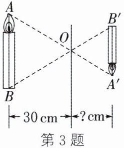 3. (2024·扬州)物理课上学过小孔成像的原理,它是一种利用光的直线传播特性实现图象投影的方法. 如图,燃烧的蜡烛(竖直放置)$AB$ 经小孔 $O$ 在屏幕(竖直放置)上成像 $A'B'$. 已知 $AB=36 cm$,$A'B'=24 cm$,小孔 $O$ 到 $AB$ 的距离为 $30 cm$,则小孔 $O$ 到 $A'B'$ 的距离为