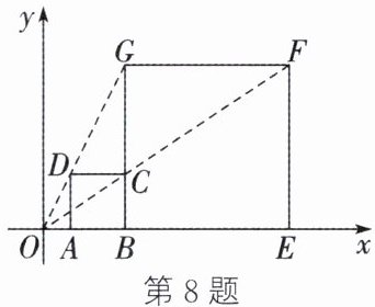 8. 如图,在平面直角坐标系中,正方形$ABCD$与正方形$BEFG$是以原点$O$为位似中心的位似图形,且相似比为$\frac{1}{3}$,点$A$,$B$,$E$在$x$轴上.若正方形$BEFG$的边长为$6$,则点$C$的坐标为