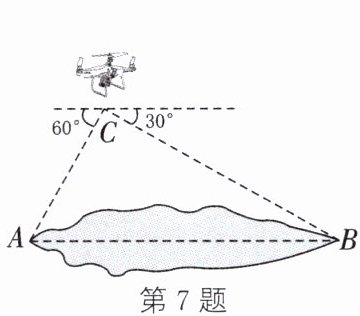 7. (2025·内蒙古)如图,因地形原因,湖泊两端$A$,$B$间的距离不易测量,某科技小组需要用无人机进行测量,他们将无人机上升并飞行至距湖面$90\mathrm{m}$的点$C$处,从点$C$测得点$A$的俯角为$60^{\circ}$,点$B$的俯角为$30^{\circ}$($A$,$B$,$C$