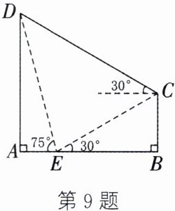 答案:9.(1)如图,过点C作$CF\perp AD$,垂足为F。由题意,得$CF// AB$,$\therefore \angle FCE = \angle CEB = 30^{\circ}$。$\because \angle DCF = 30^{\circ}$,$\therefore \angle DCE = \angle DCF + \angle FCE = 60^{\circ}$。$\because \angle AED = 75^{\circ}$,$\therefore \angle DEC = 180^{\circ} - \angle AED - \angle CEB = 75^{\circ}$。$\therefore \angle CDE = 180^{\circ} - \angle DEC - \angle DCE = 45^{\circ}$