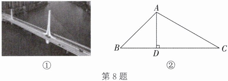 答案:8.设$AD = xm$。$\because AD\perp BC$,$\therefore \angle ADB = \angle ADC = 90^{\circ}$。在$ Rt\triangle ABD$中,$\angle ABD = 45^{\circ}$,$\therefore BD = \frac{AD}{\tan\angle ABD} = \frac{x}{\tan45^{\circ}} = x(m)$。在$ Rt\triangle ACD$中,$\angle ACD = 30^{\circ}$,$\therefore CD = \frac{AD}{\tan\angle ACD} = \frac{x}{\tan30^{\circ}} = \sqrt{3}x(m)$。$\because BC = BD + CD = 80m$,$\therefore x + \sqrt{3}x = 80$,解得$x = 40\sqrt{3} - 40$。$\therefore AD = (40\sqrt{3} - 40)m$。$\therefore$桥塔AD的高度为$(40\sqrt{3} - 40)m$