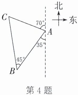 答案:4.如图,过点A作AH⊥BC于点H.由条件可知∠BAH = $90^{\circ} - ∠B = 45^{\circ}$,∠CAB = $180^{\circ} - 70^{\circ} - 35^{\circ} = 75^{\circ}$.
