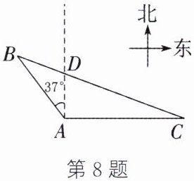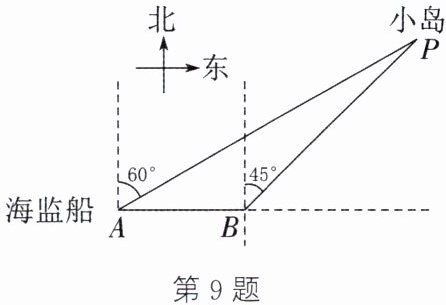 答案:9.(1)如图,过点P作PC⊥AB,交AB的延长线于点C.由题意,得∠PAC = $90^{\circ} - 60^{\circ} = 30^{\circ}$,∠PBC = $90^{\circ} - 45^{\circ} = 45^{\circ}$,AB = $20\sqrt{2}$海里.设PC = x海里,则易得BC = x海里.在Rt△PAC中,