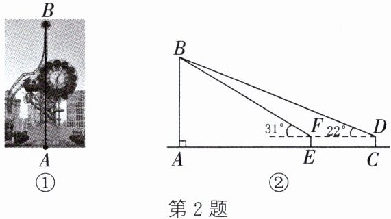 2. (2025 · 天津)在综合与实践活动中,要用测角仪测量天津站附近世纪钟建筑 $AB$ 的高度(如图 ①). 某学习小组设计了一个方案:如图②,点 $A$,$E$,$C$ 依次在同一水平线上,$CD \perp AC$,$EF \perp AC$,且 $CD = EF = 1.7\ m$. 在点 $D$ 处测得世纪钟建筑顶部 $B$ 的仰角为 $22°$,在点 $F$ 处测得世纪钟建筑顶部 $B$ 的仰角为 $31°$,$CE = 32\ m$. 根据该学习小组测得的数据,计算世纪钟建筑 $AB$ 的高度(结果精确到 $1\ m$,参考数据:$\tan 22° \approx 0.4$,$\tan 31° \approx 0.6$)。