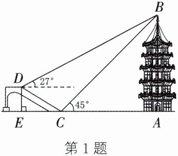 1. 在综合与实践活动中,要利用测角仪测量塔的高度,如图,塔 $AB$ 前有一座高为 $DE$ 的观景台,已知 $CD = 8\ m$,$CD$ 的坡度 $i = 1:\sqrt{3}$,点 $E$,$C$,$A$ 在同一水平线上. 某学习小组在观景台 $C$ 处测得塔顶部 $B$ 的仰角为 $45°$,在观景台 $D$ 处测得塔顶部 $B$ 的仰角为 $27°$. 求: