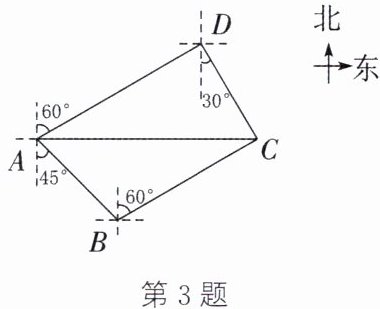 3. (2024 · 重庆 A 卷)如图,甲、乙两艘货轮同时从 $A$ 港出发,分别向 $B$,$D$ 两港运送物资,最后到达 $A$ 港正东方向的 $C$ 港装运新的物资. 甲货轮沿 $A$ 港的东南方向航行 $40$ 海里后到达 $B$ 港,再沿北偏东 $60°$ 方向航行一定距离到达 $C$ 港. 乙货轮沿 $A$ 港的北偏东 $60°$ 方向航行一定距离到达 $D$ 港,再沿南偏东 $30°$ 方向航行一定距离到达 $C$ 港(参考数据:$\sqrt{2} \approx 1.41$,$\sqrt{3} \approx 1.73$,$\sqrt{6} \approx 2.45$).