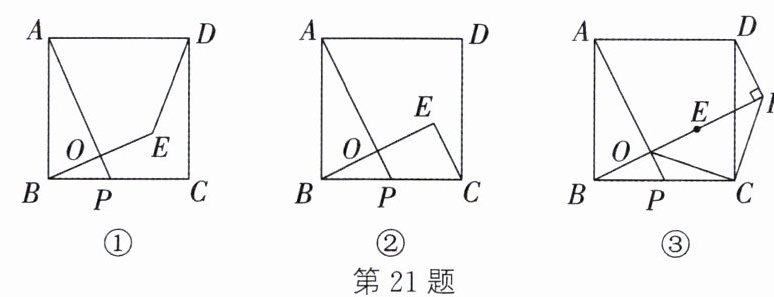 21. 在正方形$ ABCD$中,点$ P$在边$ BC$上(不与端点$ B$,$ C$重合),点$ B$关于直线$ AP$的对称点为$ E$,$ BE$与$ AP$交于点$ O$.