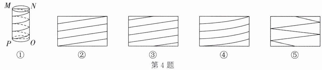 4. 如图①,$MN$是圆柱底面的直径,$NO$是圆柱的高,在圆柱的侧面上,过点$M$,$P$有一条绕四周且路径最短的金属丝,现将圆柱侧面沿$MP$剪开,所得的侧面展开图是