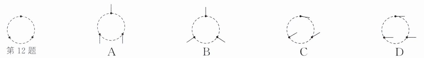 12. 平地上立有三根等高的木杆,其俯视图如图所示,在某一时刻三根木杆在阳光下的影子可能是 (