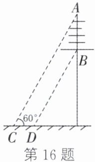 16. 如图,一根电线杆的接线柱部分 $AB$ 在阳光下的投影 $CD$ 的长为 $1.2 m$,太阳光线与地面的夹角 $\angle ACD = 60°$,则 $AB$ 的长为 (