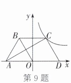 9. 如图,在平面直角坐标系中,等边三角形$AOB$和菱形$OBCD$的边$AO,OD$都在$x$轴上,反比例函数$y=\frac{k}{x}(k \neq 0)$在第一象限的图象经过点$C$. 若$\triangle ABC$的面积为$4\sqrt{3}$,则$k$的值为