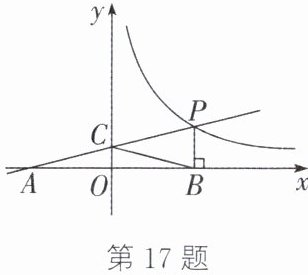 17. 如图,一次函数$y=kx+b$的图象与反比例函数$y=\frac{m}{x}$在第一象限的图象交于点$P(n,2)$,与$x$轴交于点$A(-4,0)$,与$y$轴交于点$C$,$PB \perp x$轴于点$B$,且$AC=BC$.