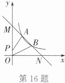 16. 如图,在平面直角坐标系中,$O$是坐标原点,一次函数$y=kx+b$的图象与反比例函数$y=\frac{n}{x}(x>0)$的图象交于$A(2,m),B(4,2)$两点,与$x$轴、$y$轴分别交于点$N,M$.