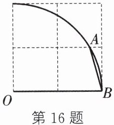 16. 如图,在$2×2$的网格中,以顶点$O$为圆心,2个单位长度为半径作圆弧,分别交图中格点(网格线的交点)、格线于$B$,$A$两点,连接$AB$,$OB$,则$\tan\angle ABO$的值为