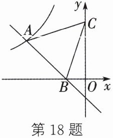 18. 如图,在平面直角坐标系中,一次函数$y = -x - 1$的图象与反比例函数$y =\frac{k}{x} (k≠0)$在第二象限内的图象交于点$A$,与$x$轴交于点$B$,点$C$的坐标为$(0,3)$,连接$AC,BC$.若$AC = BC$,则实数$k$的值为