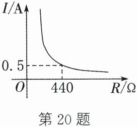 20. (8分)某种台灯的亮度控制可以通过用旋钮调节电阻控制电流的变化来实现.如图所示为该种台灯的电流$I(A)$与电阻$R(Ω)$的关系图象,该图象经过点$(440,0.5)$.