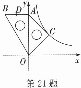 21. (8分)小军将一副三角尺按如图方式摆放在平面直角坐标系中,其中含$30°$角的三角尺$OAB$的直角边$OA$落在$y$轴上,含$45°$角的三角尺$OAC$的直角顶点$C$的坐标为$(2,2)$,反比例函数$y =\frac{k}{x} $在第一象限的图象经过点$C$.