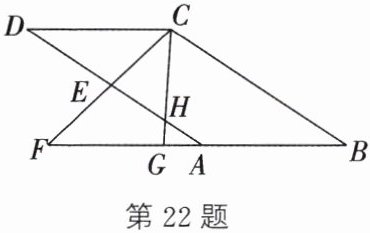 答案:22.(1)$\because$四边形$ABCD$是平行四边形,$\therefore AD// BC$,$CD// AB$。$\therefore \angle D = \angle FAD$,$\angle DCE = \angle F$。$\because E$是$AD$的中点,$\therefore DE = AE$。$\therefore \triangle CDE\cong\triangle FAE$。$\therefore CE = FE$。$\because AE// BC$,$\therefore \frac{FA}{AB}=\frac{FE}{CE}=1$。$\therefore AF = AB$。(2)$\because AG = 2$,$FG = 6$,$\therefore AF = FG + AG = 6 + 2 = 8$。$\therefore AB = AF = 8$。$\because$四边形$ABCD$是平行四边形,$\therefore CD = AB = 8$,$DC// AB$。$\therefore \angle DCF = \angle F$。$\because \angle FCG = \angle FCD$,$\therefore \angle FCG = \angle F$。$\therefore CG = FG = 6$。$\because CD// AF$,$\therefore \triangle DCH\sim\triangle AGH$。$\therefore \frac{CD}{GA}=\frac{CH}{GH}$,即$\frac{8}{2}=\frac{6 - GH}{GH}$。$\therefore GH = 1.2$。$\therefore CH = CG - GH = 6 - 1.2 = 4.8$。