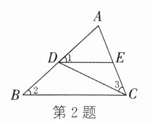 2. 如图,在$\triangle ABC$中,点$D$在边$AB$上,点$E$在边$AC$上,且$\angle 1 = \angle 2 = \angle 3$,则与$\triangle ADE$相似的三角形的个数为 (