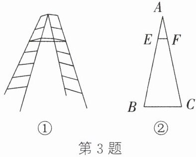 3. 如图①所示为生活中常见的人字梯,也称折梯,因其使用时左右的梯杆及地面构成一个等腰三角形,因而把它形象地称为人字梯.如图②所示为其工作示意图,拉杆$EF// BC$,$AE = \frac{1}{3}BE$,$EF = 0.4$米,则两梯杆的跨度(点$B$,$C$之间的距离)为