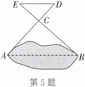 5. 如图,有一池塘,要测池塘两端$A$,$B$间的距离,可先在平地上取一点$C$,从点$C$不经过池塘可以直接到达点$A$,$B$,连接$AC$并延长到点$D$,使$CD = \frac{1}{2}AC$,连接$BC$并延长到点$E$,使$CE = \frac{1}{2}BC$,连接$DE$,量得$DE$的长为$15$米.求池塘两端$A$,$B$间的距离.