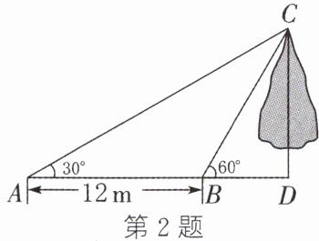 2. 如图,某数学兴趣小组想测量一棵树 $CD$ 的高度,他们先在点 $A$ 处测得树顶 $C$ 的仰角为 $30°$,然后沿 $AD$ 方向前行 $12\ m$,到达点 $B$ 处,在点 $B$ 处测得树顶 $C$ 的仰角为 $60°$(点 $A$,$B$,$D$ 在同一条直线上). 根据测量的数据可知,这棵树 $CD$ 的高度是