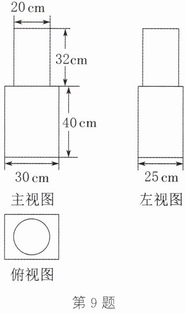 答案:9. 根据该几何体的三视图,可知该几何体由两部分组成,下面是长为$30 cm$、宽为$25 cm$、高为$40 cm$的长方体,上面是底面直径为$20 cm$、高为$32 cm$的圆柱. $\therefore$ 该几何体的侧面积为$30 × 40 × 2 + 25 × 40 × 2 + 20\pi × 32 = (4400 + 640\pi) cm^2$,体积为$30 × 25 × 40 + \pi × (\frac{20}{2})^2 × 32 = (30000 + 3200\pi) cm^3$