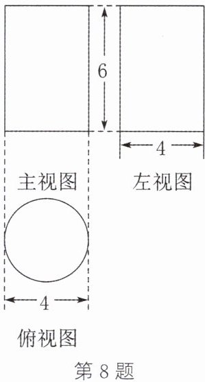 答案:8. 这个几何体的表面积为 $\pi × (\frac{4}{2})^2 × 2 + 4\pi × 6 = 32\pi$