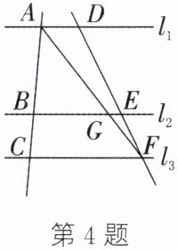 4. 如图,直线$l_1// l_2// l_3$,且$AB = 2BC$,$DF = 5\ cm$,$AG = 4\ cm$. 求$GF$,$AF$,$EF$的长.