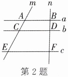 2. 如图,直线$a// b// c$,直线$m$,$n$与直线$a$,$b$,$c$分别交于点$A$,$C$,$E$,$B$,$D$,$F$. 若$AC = 4$,$CE = 8$,$BD = 3$,则$DF$的长为