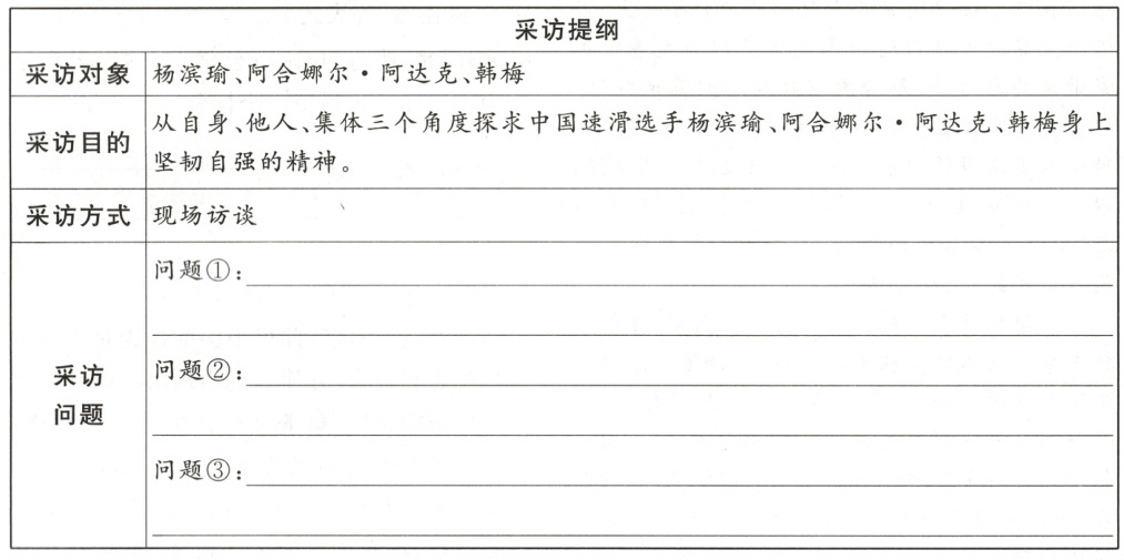 2. 【初拟采访提纲】活动开始了,语文老师宣布大家可以就自己关注的新闻热点事件拟写采访提纲。小文打算以“中国速滑选手杨滨瑜、阿合娜尔·阿达克、韩梅夺得哈尔滨亚冬会速度滑冰女子团体追逐决赛金牌”为报道素材,进行采访。下面是他初拟的采访提纲,请你补全。(6 分)