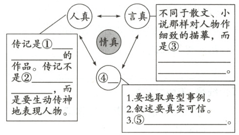 传记是记述人物生平事迹的作品。传记要求真实,凡是文中涉及的时间、地点、人物、事件等都必须是准确的,有时还要引用一些可靠的资料,保证叙述的真实可信。但是,传记又不是枯燥的生平简介或履历表,作者可以发挥想象,以填补事实的空隙,生动传神地表现人物。在记述事件时,要具体表现人物的言行,让人物“自行”展现他们的思想感情、性格特点等。传记不一定要像散文、小说那样对人物作细致入微的描摹,往往记录典型语言和重要行为就能达到所需要的表达效果。