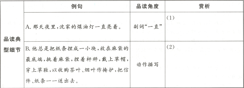 3. 阅读综合实践二 迁移 第二小组聚焦细节描写进行品读。请结合文章中的A、B两句和表格提示,赏析与传主沈知影相关的细节描写。(4分)