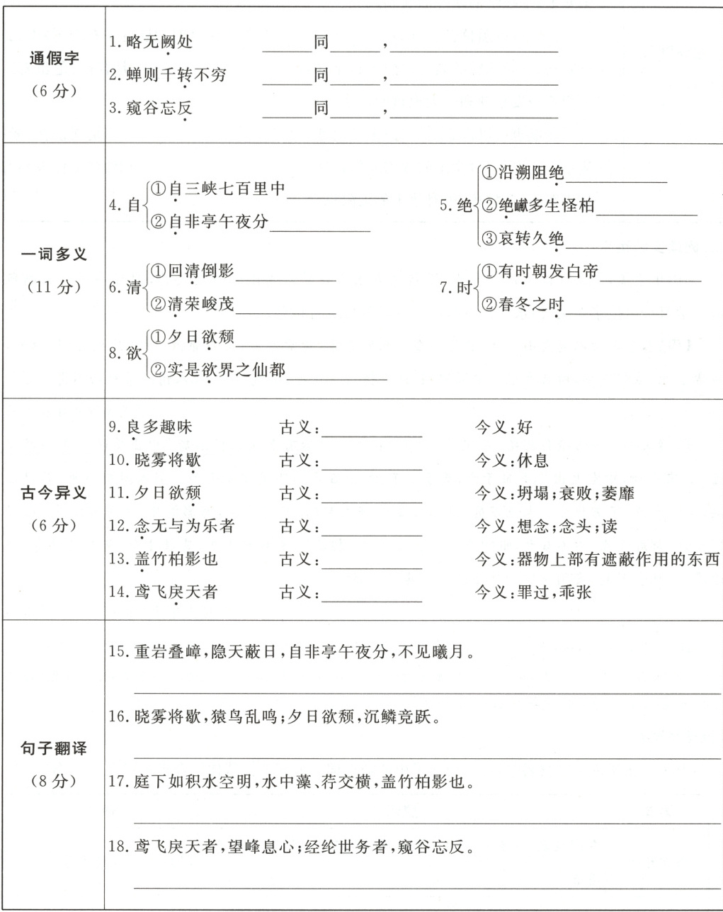 16.清晨的薄雾将要消散,猿、鸟此起彼伏地鸣叫着;夕阳快要落山了,潜游在水中的鱼儿争相跃出水面。