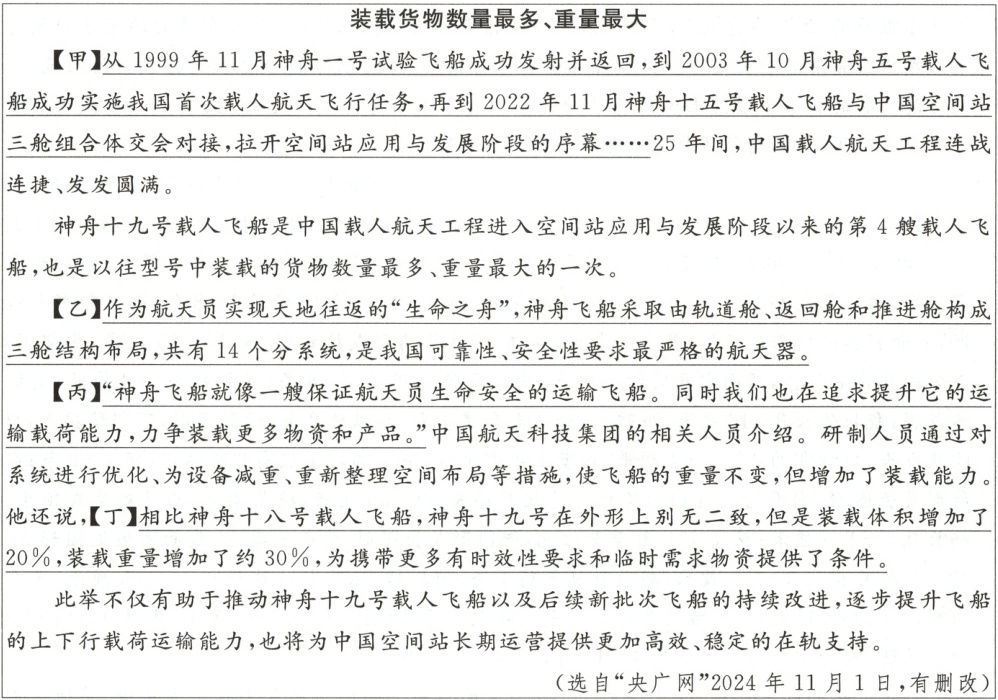1. 第一小组想以介绍神舟十九号的说明性文章的片段来展现说明性文章的准确、客观。(6分)