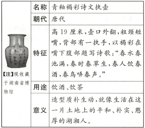 答案:2.示例:青釉褐彩诗文执壶是收藏于湖南省博物馆的唐代文物,为饮酒、饮茶之用。该壶高19厘米,壶口外翻,粗颈短嘴,背部装有一执手,以褐彩在嘴下腹部题写诗歌:“春水春池满,春时春草生,春人饮春酒,春鸟哤春声。”造型质朴生动,就像生活在这一片土地上的平和、朴实、憨厚的湖湘人。