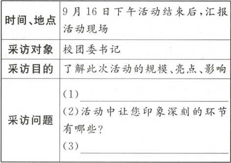 5. 本次活动取得了丰硕的育人成果,学校想对这个活动做一个宣传报道。下面是校报记者为此次活动写的采访提纲,请你根据采访目的,补充两个采访问题。(4分)