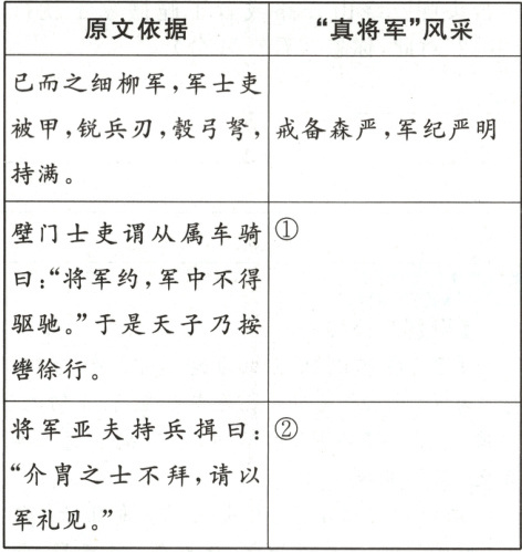 5. 教材习题一 变式 下面是小语整理的周亚夫“真将军”风采一览表,请你结合文章,仿照示例完成表格。(2 分)
