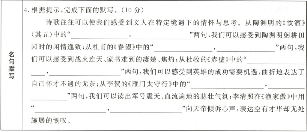 4.采菊东篱下 悠然见南山 烽火连三月 家书抵万金