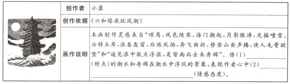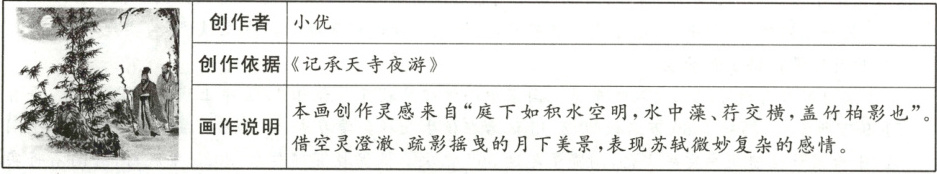 18. 以下是小优和小翼创作的关于“夜游”主题的画作及简介,请根据示例及【乙】文的内容和主旨,帮助小翼完成画作说明。(4 分)