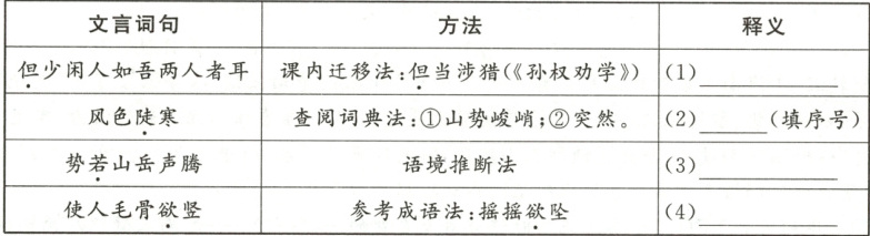 15. 阅读古文时,可以根据不同的方法理解词义。请完成下表。(4 分)