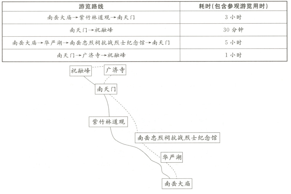 5. 听到大家的分享后,小语萌发了徒步攀登衡山的想法。他准备周末中午 12 点从南岳大庙出发,预计下午 4 点到达祝融峰,中途想参观三处景点。请根据图示,为他规划攀登路线,并写一段文字加以说明。要求:精简顺畅,用时清晰,不超过 70 字。(4 分)