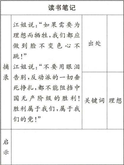 摘录二:人们背诵着江姐信中光芒四射的词句:“毒刑拷打是太小的考验!竹签子是竹做的,共产党员的意志是钢铁!”