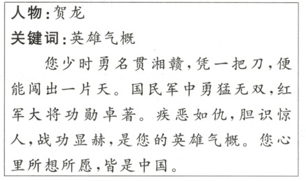示例二:人物:毛泽东 关键词:英雄气概 从湖南到延安,您把一生倾洒给神州大地。两万五千里长征路,您信步迈越;八千里山河金戈铁马,您谈笑风生。栉风沐雨,鞠躬尽瘁。您点燃了中国工农革命的星星之火,开启了中华民族伟大复兴的序幕。