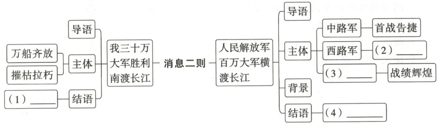 根据《消息二则》内容,《我三十万大军胜利南渡长江》的结构为导语、主体、结语,结语部分是“英雄式的战斗”;《人民解放军百万大军横渡长江》主体分述中路军(首战告捷)、西路军(所向无敌)、东路军(战绩辉煌),背景交代我军渡江区域广大,结语为“我军前锋,业已切断镇江无锡段铁路线”。