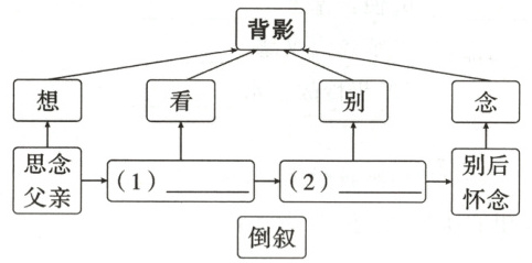 《背影》以“背影”为线索,开篇“我与父亲不相见已二年余了,我最不能忘记的是他的背影”点出“思念父亲”;接着通过回忆浦口车站送别的场景,描写父亲为“我”买橘子时的背影,这是“刻画背影”;最后写别后对父亲背影的怀念。导图中“看”对应回忆中的具体事件,即父亲买橘子的背影,故(1)为“刻画背影”;“别”承接送别场景,(2)为“车站送别”。