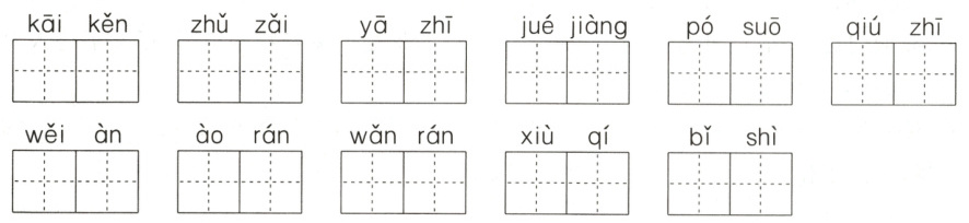 根据人教版语文八年级上册《白杨礼赞》课文内容及课后字词积累,填写相应的汉字和拼音。注意“开垦”“主宰”“倔强”“婆娑”“虬枝”“伟岸”“傲然”“宛然”“秀颀”“鄙视”“妙手偶得”“潜滋暗长”“旁逸斜出”的正确书写;“倦怠”的“怠”读dài,“坦荡如砥”的“砥”读dǐ,“恹恹欲睡”的“恹”读yān,“不折不挠”的“挠”读náo。
