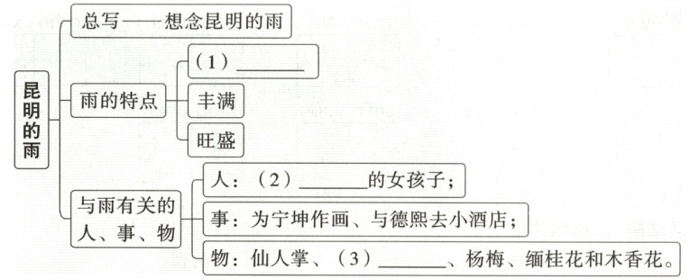 (1) 根据课文内容,昆明的雨的特点是雨季长,但是不连续,符合“时长”的特点。