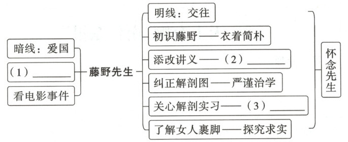 (3) 根据藤野先生关心解剖实习的事件,可以提炼出他的品质是“真诚恳挚”或“热情关心”。(根据不同版本教科书,此处答案可能有所不同,但“真诚恳挚”更为常见)