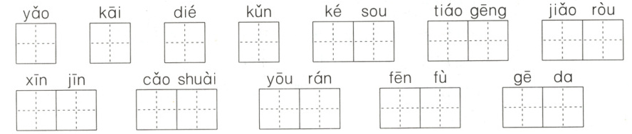 1. “yǎo”对应的汉字是“舀”;“kāi”对应的汉字是“揩”;“dié”对应的汉字是“碟”;“kǔn”对应的汉字是“捆”;“ké sou”对应的汉字是“咳嗽”;“tiáo gēng”对应的汉字是“调羹”;“jiǎo ròu”对应的汉字是“绞肉”;“xīn jīn”对应的汉字是“薪金”;“cǎo shuài”对应的汉字是“草率”;“yōu rán”对应的汉字是“悠然”;“fēn fù”对应的汉字是“吩咐”;“gē da”对应的汉字是“疙瘩”;“shēn wù tòng jué”对应的汉字是“深恶痛绝”;“bù yǐ wéi rán”对应的汉字是“不以为然”。